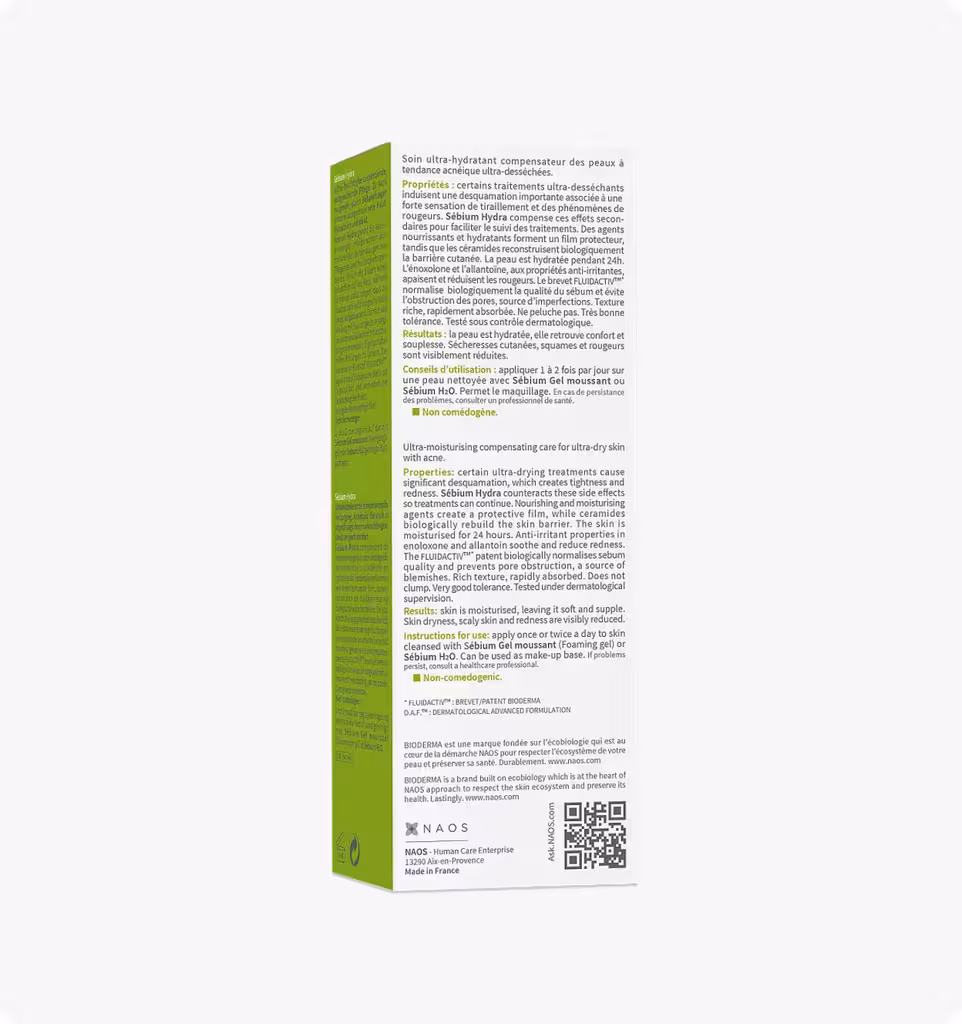 В период лечения тяжелых форм акне кожа может очень сильно сохнуть, трескаться, раздражаться и испытывать общий дискомфорт. Крем Bioderma Sébium Hydra помогает восстановить кожу, качественно и надолго увлажнить ее и успокоить. Результаты тестов говорят, что после 14 дней использования в 89 % случаев дерматологи, наблюдающие пациентов, заметили разницу. В составе есть церамиды, которые восстанавливают целостность защитного барьера кожи и предотвращают преждевременную потерю влаги.