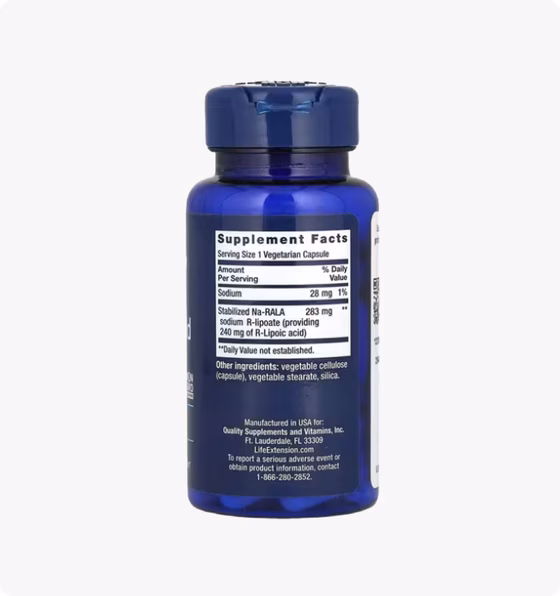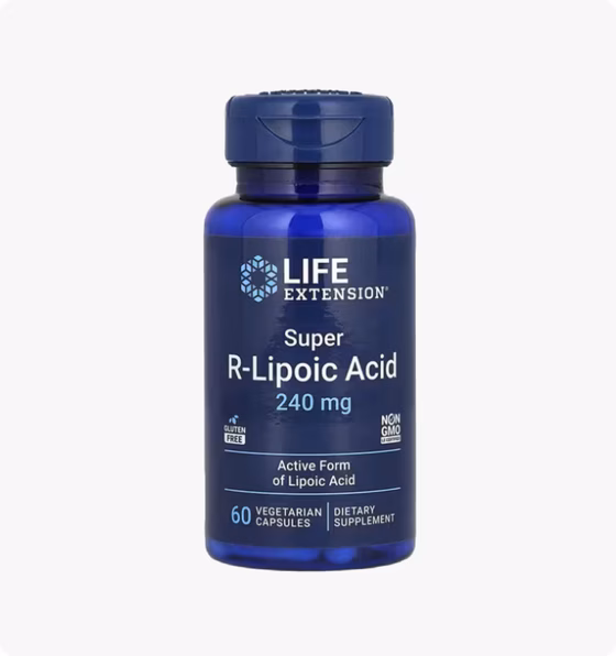 Супер R-липоевая кислота — это добавка для поддержания здоровья на уровне клеток. В организме липоевая кислота является эффективным антиоксидантом. Эта добавка с липоевой кислотой содержит эффективную дозу «активной» формы альфа-липоевой кислоты (R-липоевая кислота) — 240 мг — в каждой вегетарианской капсуле. В каждом флаконе содержится 60 капсул, которых хватает на 1–2 месяца приема, в зависимости от дозировки. Без ГМО, без глютена, произведено в США.