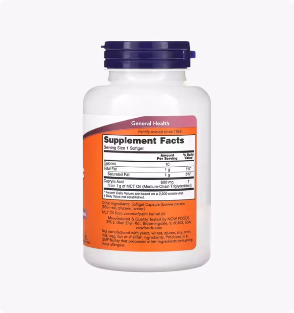 Каприловая кислота NOW® — это питательное вещество природного происхождения, также известное как октановая кислота. Каприловая кислота — это жирная кислота со средней длиной цепи (среднецепочные триглицериды), которая в природе содержится в кокосовом и пальмоядровом масле.