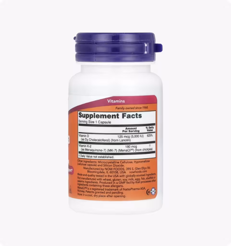 Добавка «Мега D3 и MK-7» от NOW® сочетает в себе витамины D3 и K2, два питательных вещества, роль которых в поддержании здоровья костей, зубов и сердечно-сосудистой системы детально изучена. Взаимодействуя с кальцием, витамин D3 поддерживает здоровье костной системы, а по данным недавних исследований, он также имеет важное значение для работы иммунной системы. MK-7 MenaQ7® — это уникальная биодоступная форма витамина К2, изготовленная без сои, которая играет ключевую роль в поддержании здоровья артерий благодаря своей способности обеспечивать правильный обмен кальция в кровеносных сосудах и артериях. Кроме того, витамин K2 способствует формированию прочных и здоровых костей.
