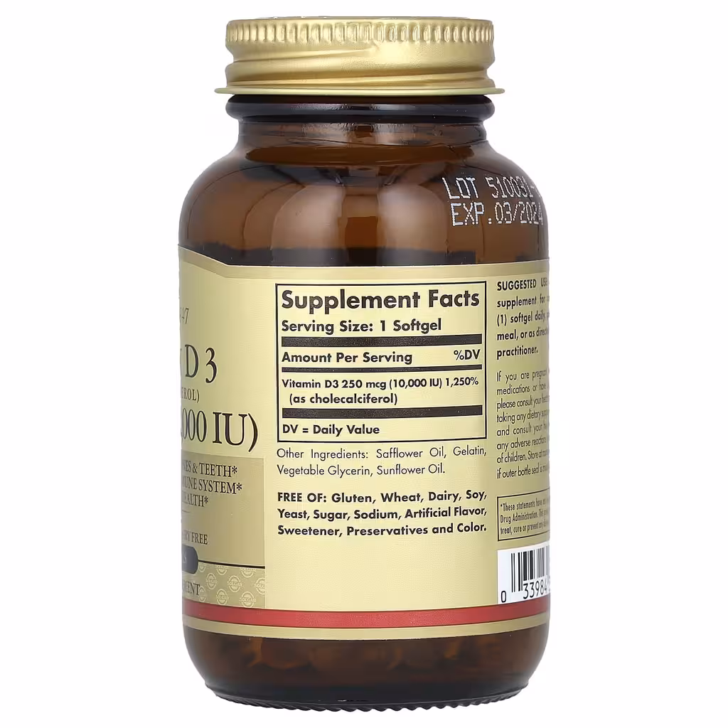 Витамин D необходим для усвоения кальция, который помогает поддерживать здоровье костей и зубов. Кроме того, витамин D поддерживает здоровую иммунную систему и нервно-мышечную функцию. Витамин D3 в этом продукте представляет собой ту же форму, которую организм вырабатывает, когда наша кожа подвергается воздействию солнечного света. По мере старения организм усваивает это питательное вещество менее эффективно. Данный препарат с улучшенной рецептурой витамина D3 предлагается в виде наполненных жидкостью капсул, которые хорошо усваиваются и легко растворяются.