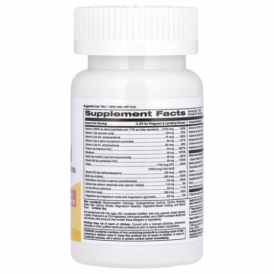 Витамин A (83% в виде ретинилпальмитата и 17% в виде бета-каротина), витамин C (в виде аскорбиновой кислоты), витамин D (в виде витамина D3, холекальциферола), витамин E (в виде d-альфа токоферил сукцината), витамин K (в виде витамина K1, фитонадиона), тиамин (в виде тиамина гидрохлорида), рибофлавин, ниацин (в виде никотиновой кислоты и никотинамида), витамин B6 (в виде пиридоксина гидрохлорида), фолат, витамин В12 (в виде метилкобаламина), биотин (в виде d-биотина), пантотеновая кислота (в виде d-пантотената кальция), кальций (в виде карбоната кальция и цитрата кальция), железо (в виде карбонила железа), йод (из бурых водорослей), магний (в виде оксида магния и глицината магния), цинк (в виде оксида цинка и цитрата цинка), селен (в виде селенита натрия), медь (в виде глицината меди), марганец (в виде сульфата марганца), хром (в виде пиколината хрома), молибден (в виде аминокислотного хелата молибдена), смесь растительных компонентов и цельнопищевых продуктов (плоды органической папайи, листья органической люцерны, органическая спирулина, органическая хлорелла), бетаин (в виде гидрохлорида бетаина), Цитрусовые биофлавоноиды (из цитрусовых), инозитол., глутаминовая кислота (в виде гидрохлорида глутаминовой кислоты), гесперидин (из цитрусов), рутин, бор (из цитрата бора).
