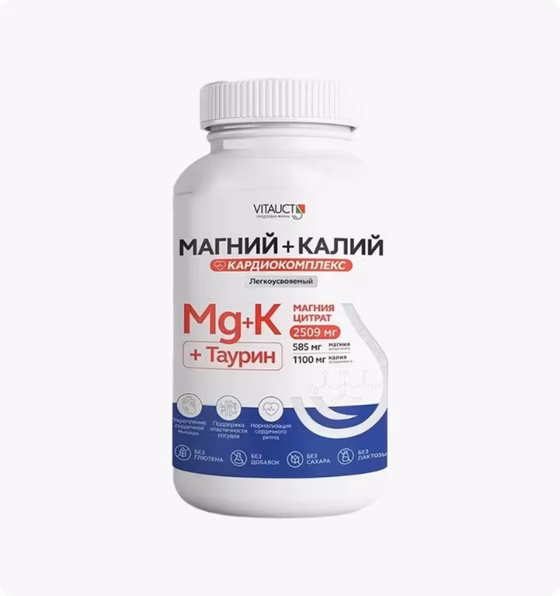 Кардиокомплекс (Магний + Калий + Таурин) от Vitauct снижает риск развития инфаркта и других сердечно-сосудистых заболеваний, также рекомендован для устранения дефицита калия и магния в составе комбинированной терапии при различных проявлениях ишемической болезни сердца.Компоненты способствуют: