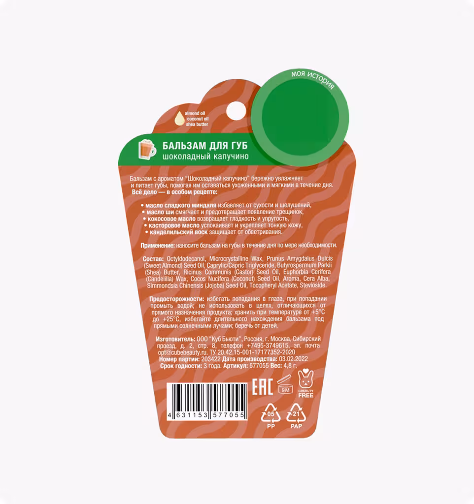 Бальзам с ароматом "Шоколадный капучино" бережно увлажняет и питает губы, помогая им оставаться ухоженными и мягкими в течение дня. Всё дело — в особом рецепте: