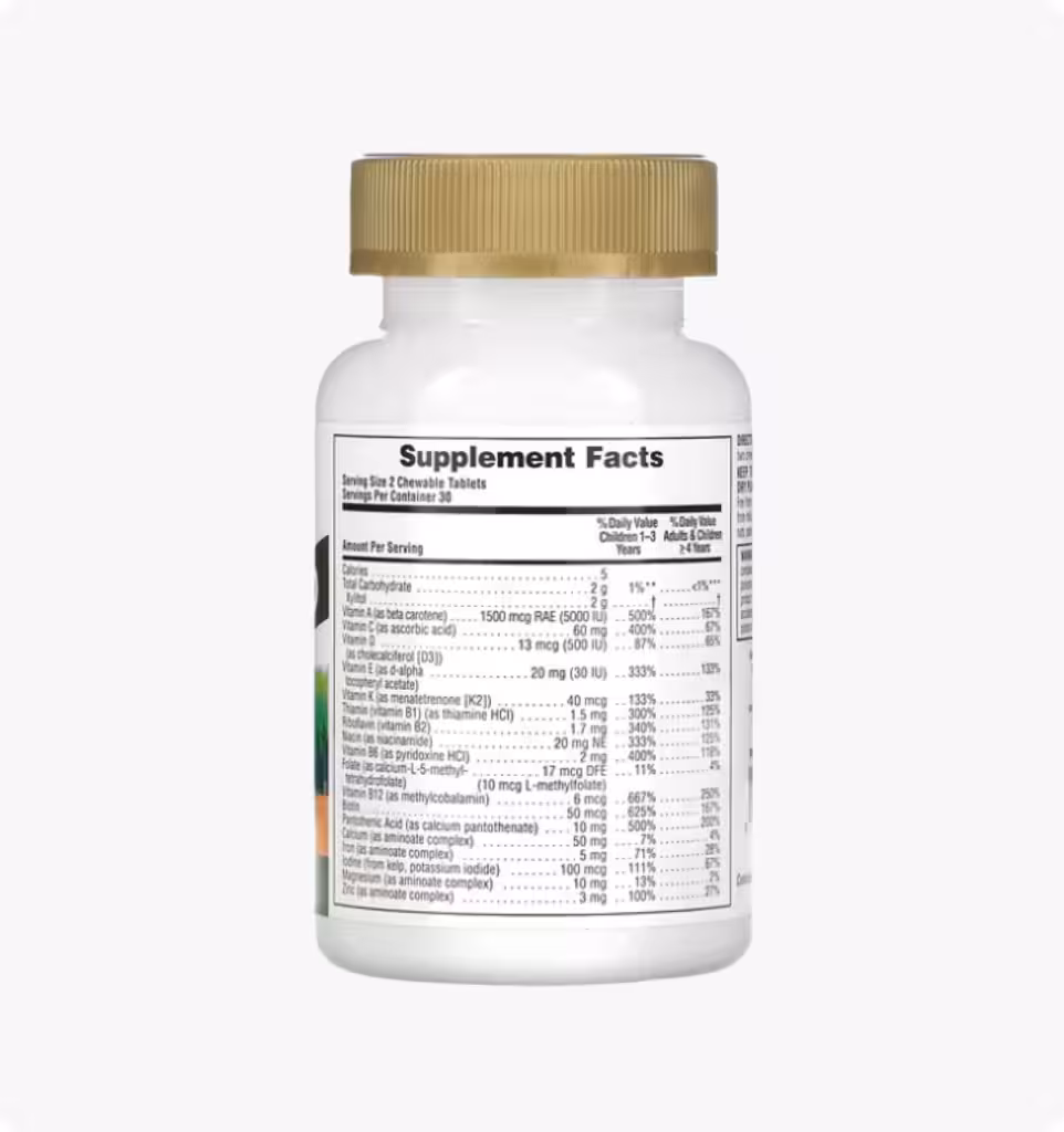 Ксилитол, натуральные ароматизаторы, карбонат кальция, лимонная кислота, гуаровая камедь, стеарат магния, натуральный краситель (свекла, виноград, аннато), стеариновая кислота, смесь цельных продуктов, сертифицированная по стандарту Organic Gold Standard (органическое яблоко, экстракт ацеролы, ростки брокколи, ростки цветной капусты, листовая капуста, мицелий гриба кордицепса, капуста кудрявая, ростки капусты кудрявой, мицелий гриба-барана, крапива, петрушка, сок свеклы, сок моркови, спирулина, мицелий гриба рейши, мицелий гриба шиитаке, шпинат, томатный сок, голубика, черника, хлорелла), фумарат железа, оксид магния, аминоат калия, оксид цинка, шиповник, морковь, мальпигия (Malpighia glabra), цельный коричневый рис, йодид калия, яблочный пектин, инозитол, брокколи, шпинат, плоды манго, плоды папайи, битартрат холина, минеральные аминоаты (хелаты из цельного коричневого риса).