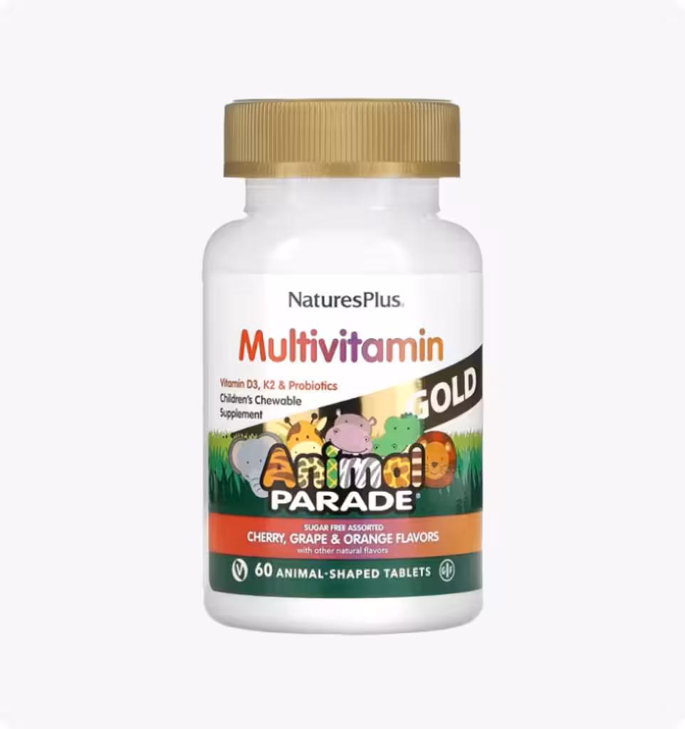 Дети не заботятся о правильном питании — они слишком заняты своими детскими делами. Но родители заботятся и знают о важности витаминов и минералов. Компания Natures Plus создала веселые, вкусные и питательные мультивитамины Animal Parade® Multi GOLD! Содержит более 20 цельных продуктов, таких как брокколи и шпинат, все важные витамины, ключевые минералы, незаменимые жирные кислоты и многое другое!