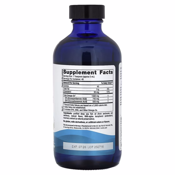 Омега-3 от Nordic Naturals содержит 1560 мг омега-3 в каждой порции, что намного превышает рекомендованную экспертами дозировку в 500 мг в день. Адекватное употребление омега-3 необходимо для поддержания хорошего питания и общего самочувствия, в том числе для здоровья сердца и мозга, а также поддержания настроения, когнитивных способностей и иммунитета.