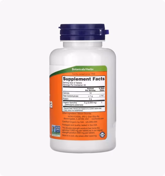 Спирулина от NOW® содержит комплекс натуральных питательных веществ, присутствующих в натуральных и органических продуктах.