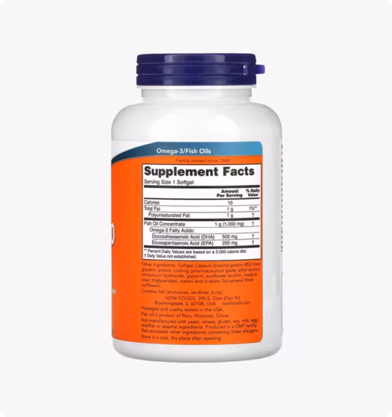ДГК-500 от NOW® содержит больше ДГК (500 мг на капсулу), чем продукт с обычной силой действия (250 мг на капсулу), созданный нашей компанией. Этот концентрат рыбьего жира производится в соответствии со строгими стандартами контроля качества. Он проверен на отсутствие потенциально опасных концентраций загрязняющих веществ, например, полихлордифенилов, диоксинов, ртути и других тяжелых металлов. Если прием рыбьего жира вызывает тошноту или отрыжку, эти желатиновые капсулы без запаха, покрытые кишечнорастворимой оболочкой, помогут легче перенести прием рыбьего жира.