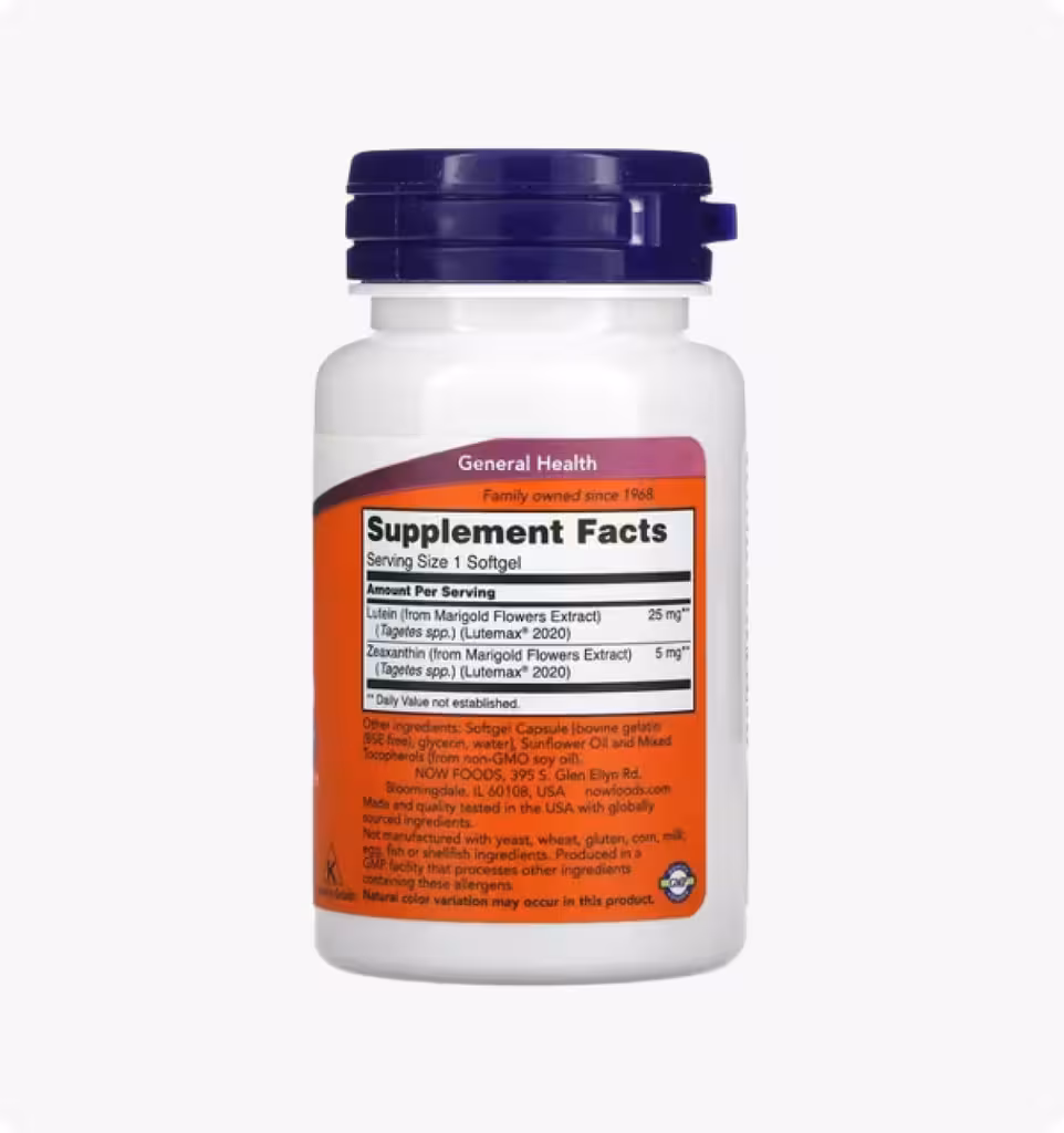 Лютеин и зеаксантин — это каротиноидные пигменты, которые часто вместе содержатся в овощах и ценятся за способность нейтрализовать свободные радикалы. В организме они находится в основном в макуле, специализированной области глаза, отвечающей за центральное зрение. Лютеин и зеаксантин действуют как первичный фильтр высокоэнергетического синего света и способствуют нормальному здоровью зрения, нейтрализуя свободные радикалы, образующиеся при воздействии света. Этот продукт способствует восстановлению зрения после воздействия яркого света и поддерживает здоровую контрастную чувствительность.