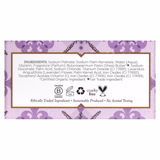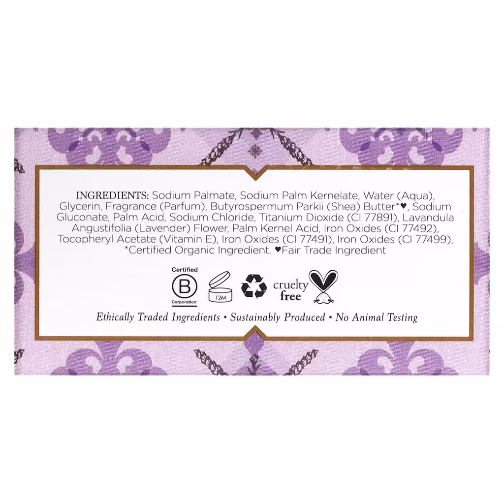 Натрия пальмитат, пальмовый кернелат натрия, вода (aqua), глицерин, ароматизатор (отдушка), масло ши (butyrospermum parkii)*♥, глюконат натрия, пальмовая кислота, хлорид натрия, диоксид титана (CI 77891), цветки лаванды (lavandula angustifolia), пальмоядровая кислота, оксиды железа (CI 77492), токоферил ацетат (витамин Е), оксиды железа (CI 77491), оксиды железа (CI 77499).