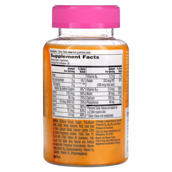 Крахмальная патока, сахар, трикальций фосфат, желатин, вода, аскорбиновая кислота; ингредиенты, содержание которых менее 2%: биотин, цитрат кальция, лактат кальция, лимонная кислота, dl-альфа-токоферил ацетат, краситель синий 1 FD&C, краситель красный 40 FD&C, краситель желтый 5 FD&C (тартразин), фолиевая кислота, молочная кислота, яблочная кислота, натуральные и искусственные ароматизаторы, никотинамид, пиридоксин гидрохлорид, ацетат витамина A, витамин B12 (цианокобаламин), витамин D3 (холекальциферол), витамин K1 (фитоменадион).