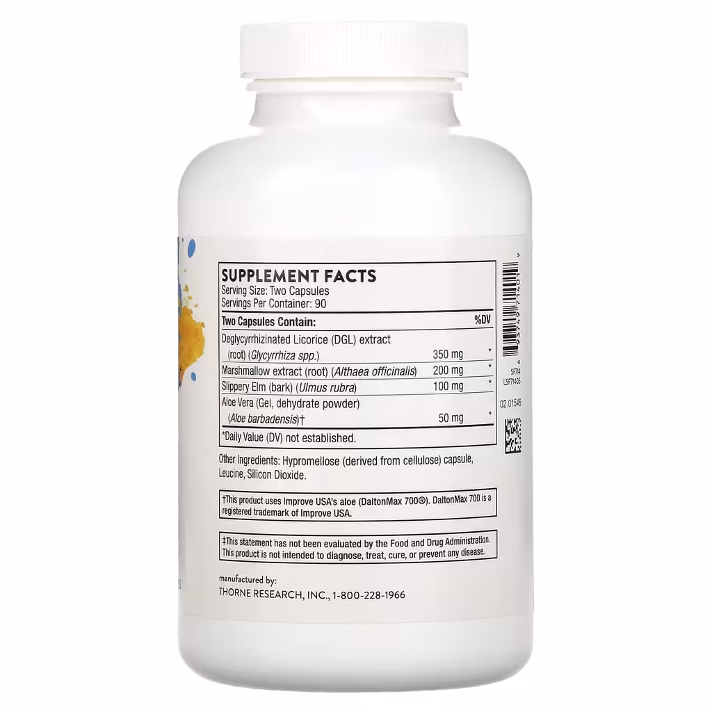 Хотя алоэ вера обладает значительной гастропротекторной эффективностью, некоторые формы алоэ вера могут оказывать слабительное действие. Ингредиент алоэ вера от GI Relief поступает из внутреннего филе растения алоэ вера, что позволяет избежать этого эффекта. Точно так же препараты корня солодки, поддерживающие работу желудка и двенадцатиперстной кишки, могут вызвать повышение артериального давления у некоторых людей при приеме в больших количествах. Поэтому из солодки в GI Relief удален глицирризин, который предотвращает повышение артериального давления. GI Relief также содержит кору скользкого вяза (Ulmus rubra) и корень алтея (Althea officinalis), которые содержат слизистые компоненты, успокаивающие пищеварительный тракт. Чтобы снять раздражение пищевода, GI Relief можно вынуть из капсулы и смешать с теплой водой и выпить в виде чая.