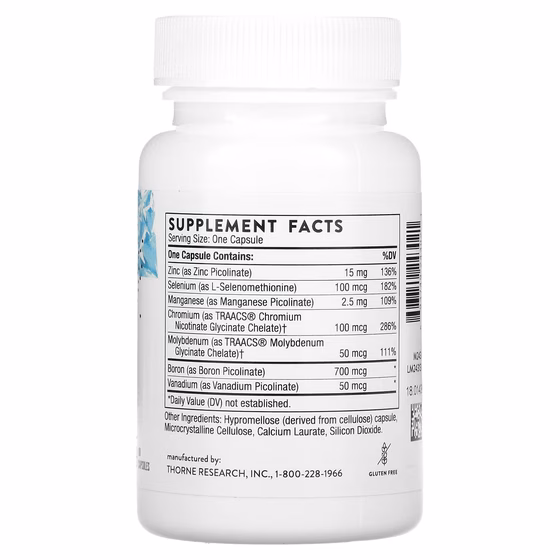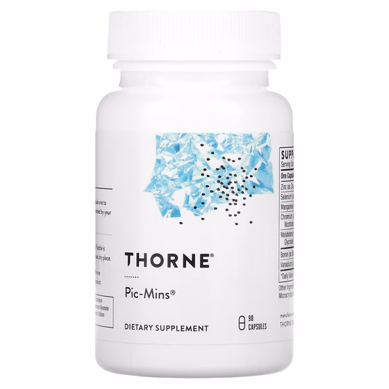 Исследования микроэлементов доказали их важность для здоровья человека. Микроэлементы являются кофакторами многих ферментативных реакций в организме. Кроме того, они необходимы для нормальной функции гормонов и нейромедиаторов. Дефицит одного или нескольких микроэлементов может негативно сказаться на здоровье сердечно-сосудистой системы, костей, фертильности, когнитивной и иммунной функциях. Даже небольшой дефицит микроэлементов может привести к недостаточному росту и развитию. Хотя многие из микроэлементов естественным образом содержатся во фруктах и овощах, истощение почвы привело к тому, что большая часть современных продуктов не содержит этих необходимых питательных веществ. В состав Pic-Mins от Thorne входят семь незаменимых микроэлементов: цинк, селен, хром, марганец, молибден, бор и ванадий.