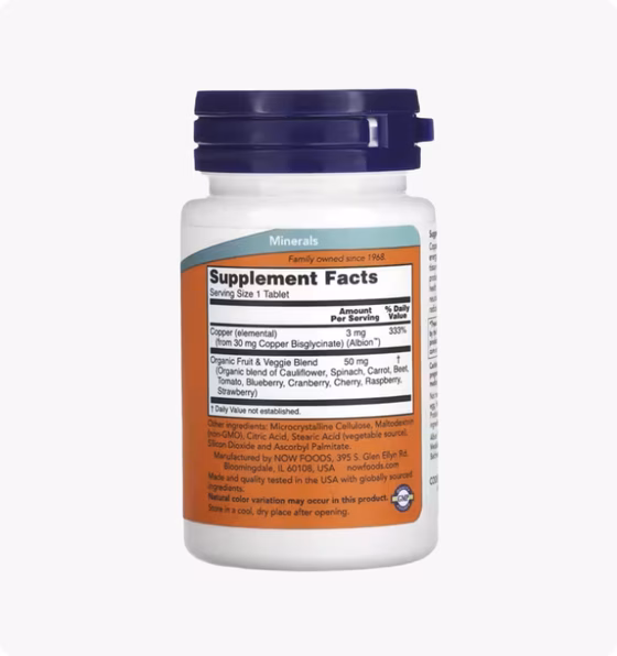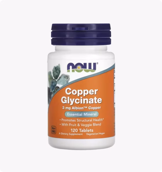 Медь - важный микроэлемент, участвующий в выработке энергии, метаболизме железа, синтезе соединительной ткани и производстве нейромедиаторов. Медь также имеет решающее значение для здоровья костей, сердечно-сосудистой системы, липидного обмена, неврологического здоровья, здоровья кожи и защиты от свободных радикалов.