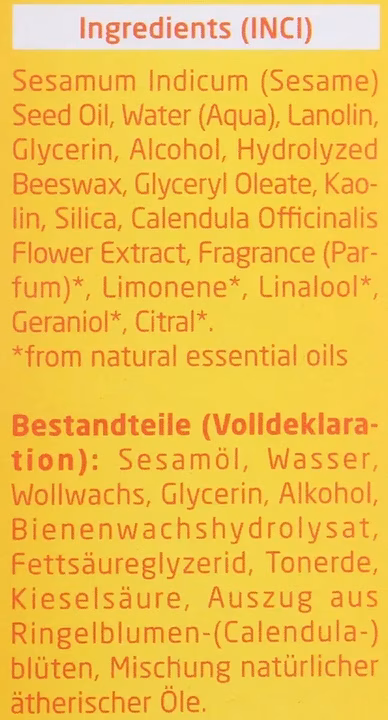 Sesamum indicum (sesame) seed oil, water (aqua), lanolin, glycerin, alcohol, hydrolyzed beeswax, glyceryl oleate, kaolin, silica, calendula officinalis flower extract, fragrance (parfum), limonene, linalool, geraniol, citral