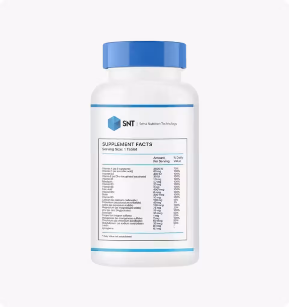 В одной порции (1 капсула): Витамин А (в виде бета-каротина) - 3500 МЕ, Витамин С (в виде аскорбиновой кислоты) - 60 мг, Витамин D3 - 400 МЕ, Витамин Е (в виде Dl-a-токоферилсукцината) - 30 МЕ, Витамин В1 1,5 мг, Рибофлавин 1,7 мг, Витамин В3 20 мг, Витамин В6 2 мг, Фолиевая кислота 400 мкг, Витамин В12 6 мкг, Биотин 300 мкг, Витамин В5 10 мг, Кальций (в виде карбоната кальция) 150 мг, Калий (в виде хлорида калия) 40 мг, Йод (в виде йодида калия) 150 мкг, Магний (в виде оксида магния) 75 мг, Цинк (в виде бисглицината цинка) 15 мг, Селен 35 мкг, Медь (в виде сульфата меди) 1 мг, Марганец (в виде сульфата марганца) 2 мг, Хром (в виде пиколината хрома) 60 мкг, Молибден (в виде молибдата натрия) 35 мкг, Лютеин 0,1 мг, Ликойпен 0,1 мг.