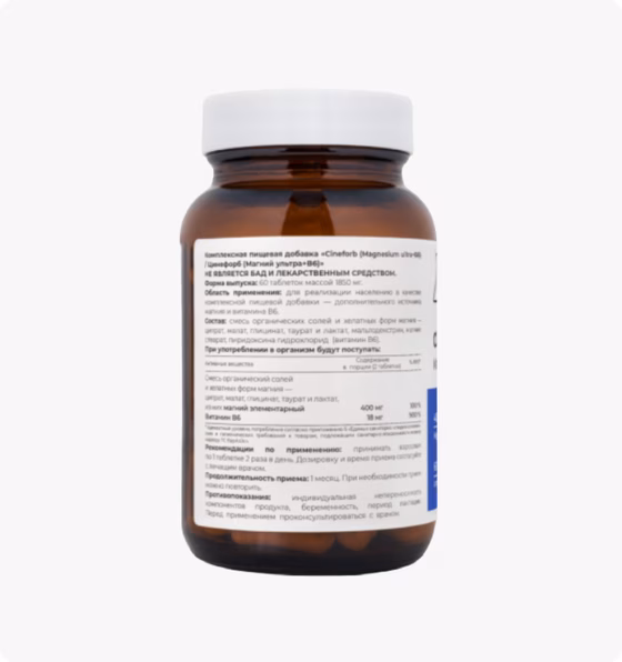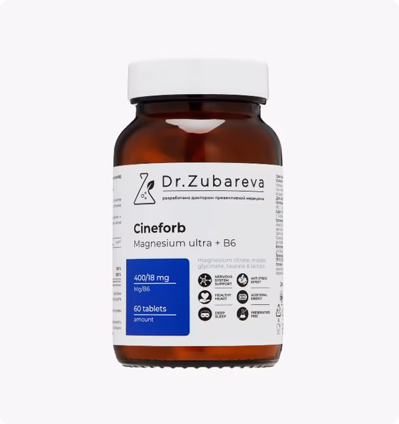 Благодаря такому мощному комплексу ингредиентов, витамины Cineforb magnesium ultra + B6 от Dr Zubareva оказывают поддержку всему организму: