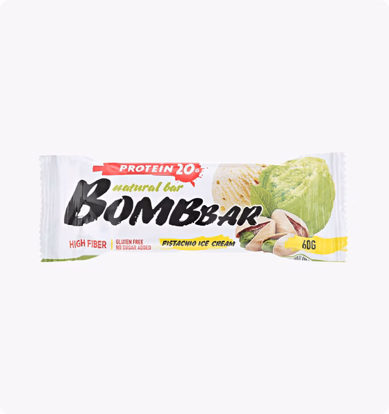 Протеиновый батончик Bombbar "Фисташковый пломбир" весом 60 граммов — это продукт для здорового питания, который позиционируется как замена обычным десертам, подходящий для спортсменов, людей на диете, а также беременных и кормящих женщин. Он не содержит добавленного сахара. Вкус и текстура: Батончик неглазированный, имеет мягкую консистенцию. Вкус описывается производителем как "фисташковый пломбир", однако некоторые покупатели отмечают, что вкус фисташки выражен слабо, а привкус протеина может быть сильным. Польза для здоровья: Высокое содержание белка способствует росту и восстановлению мышц, а пищевые волокна (клетчатка) улучшают пищеварение и способствуют насыщению. Применение: Подходит в качестве полезного перекуса, десерта к чаю или кофе, а также до или после тренировки .Предостережения: Чрезмерное потребление может вызвать слабительный эффект. Противопоказан при индивидуальной непереносимости молочного белка. Может содержать следы других орехов и арахиса.