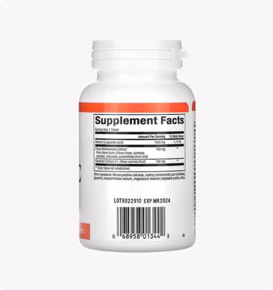 Витамин C 1000 мг содержит цитрусовые биофлавоноиды и плоды шиповника для оптимизации использования организмом витамина C. Биофлавоноиды способствуют лучшему усвоению продукта и взаимодействуют с витамином C, обеспечивая антиоксидантную защиту, поддерживая нормальный уровень коллагена и помогая усилить прочность капилляров.