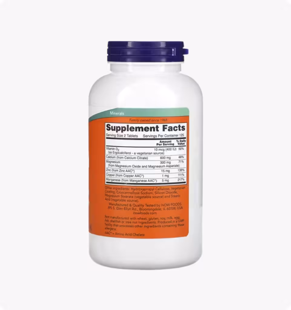 Цитрат кальция — это легко усваиваемая форма кальция, необходимого для поддержания здоровья костной системы. В состав добавки также входят витамин D, магний, цинк, медь и марганец, потому что они играют важную роль в метаболизме костной ткани.
