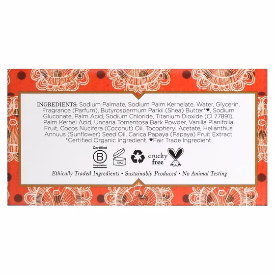 Пальмат натрия, керналат натрия, вода, глицерин, ароматизатор (парфюм), масло ши (Butyrospermum parkii)*♥, глюконат натрия, пальмовая кислота, хлорид натрия, диоксид титана (ci 77891), пальмоядровая кислота, порошок коры Uncaria tomentosa, плоды Vanilla planifolia, кокосовое масло (Cocos nucifera), ацетат токоферила, подсолнечное масло (Helianthus annuus), экстракт из плодов папайи (Carica papaya).