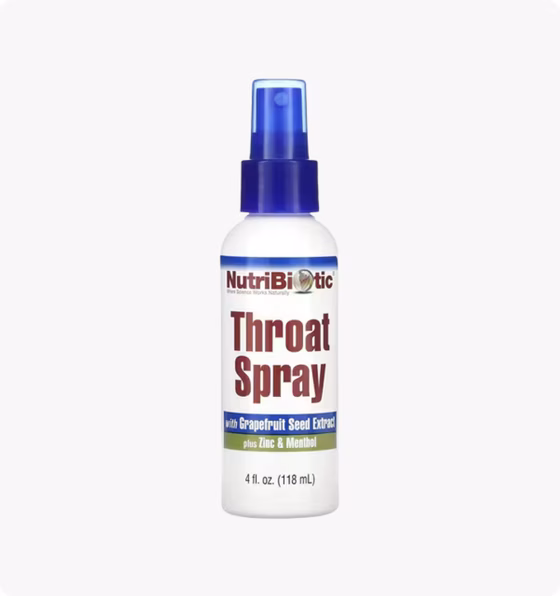 Спрей для горла от NutriBiotic с Citricidal (экстрактом косточек грейпфрута), цинком и ментолом помогает поддерживать здоровье горла и полости рта.
