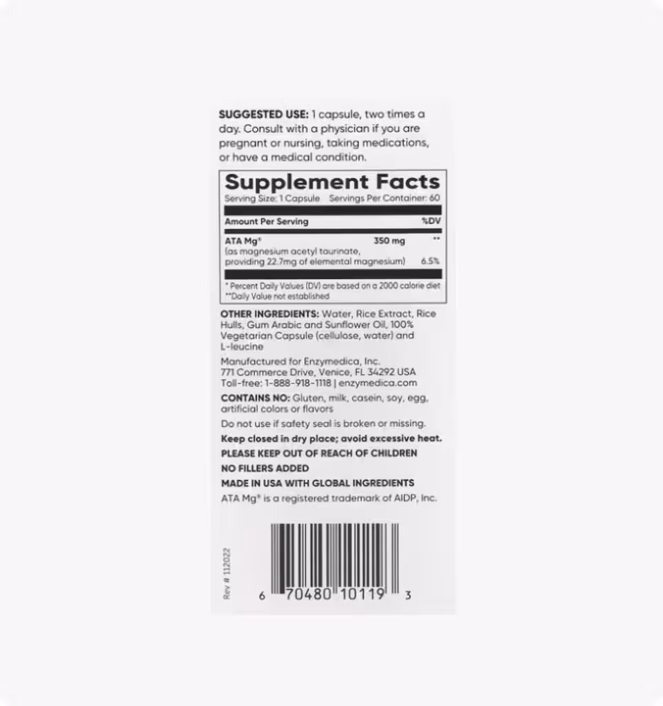ATA MgⓇ — это запатентованная форма магния, в которой этот мощный минерал сочетается с таурином, аминокислотой, используемой организмом для передачи ионов магния в клетки.