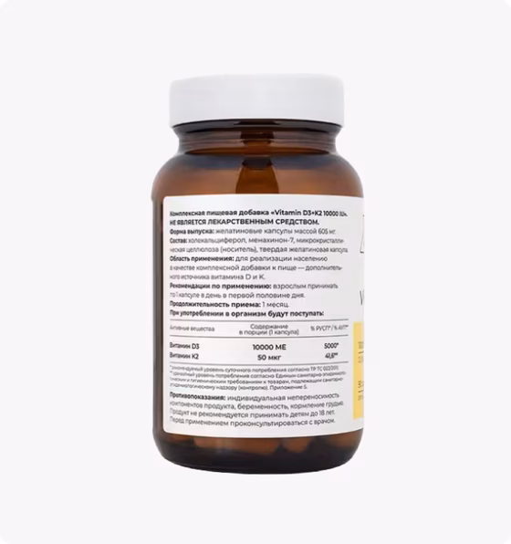 Комплексная пищевая добавка витамин D3 с K2 ( 10000IU / 50мкг ) от Доктора Зубаревой, без вредных компонентов в составе.