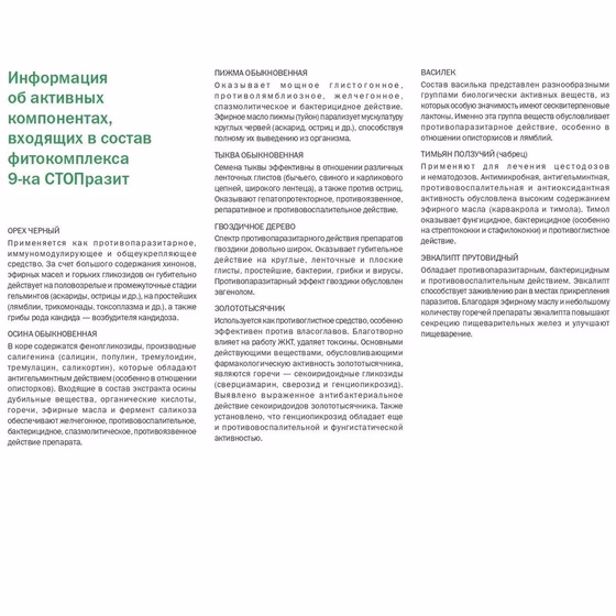 Средство от глистов 9-ка СТОПразит способствует: поражению гельминтов на всех стадиях развития (яйца, цисты, личинки, взрослые формы), безопасному выведению паразитов из ЖКТ и заживлению слизистой кишечника. Растительный противопаразитарный комплекс имеет широкий спектр воздействия на гельминты (нематодозы, цестодозы, трематодозы). Горечи способствуют похудению, ускоряют обмен веществ. Противопаразитарный сбор оказывает антибактериальное, противовоспалительное, иммуномодулирующее действие. Фитокомплекс также работает как гепатопротектор, благодаря чему достигается детокс и очищение организма, налаживается отток желчи, улучшается пищеварение. Фитосбор выводит токсины, восстанавливает пораженные органы. А также рекомендован для профилактики! Все паразиты боятся 9-ку!